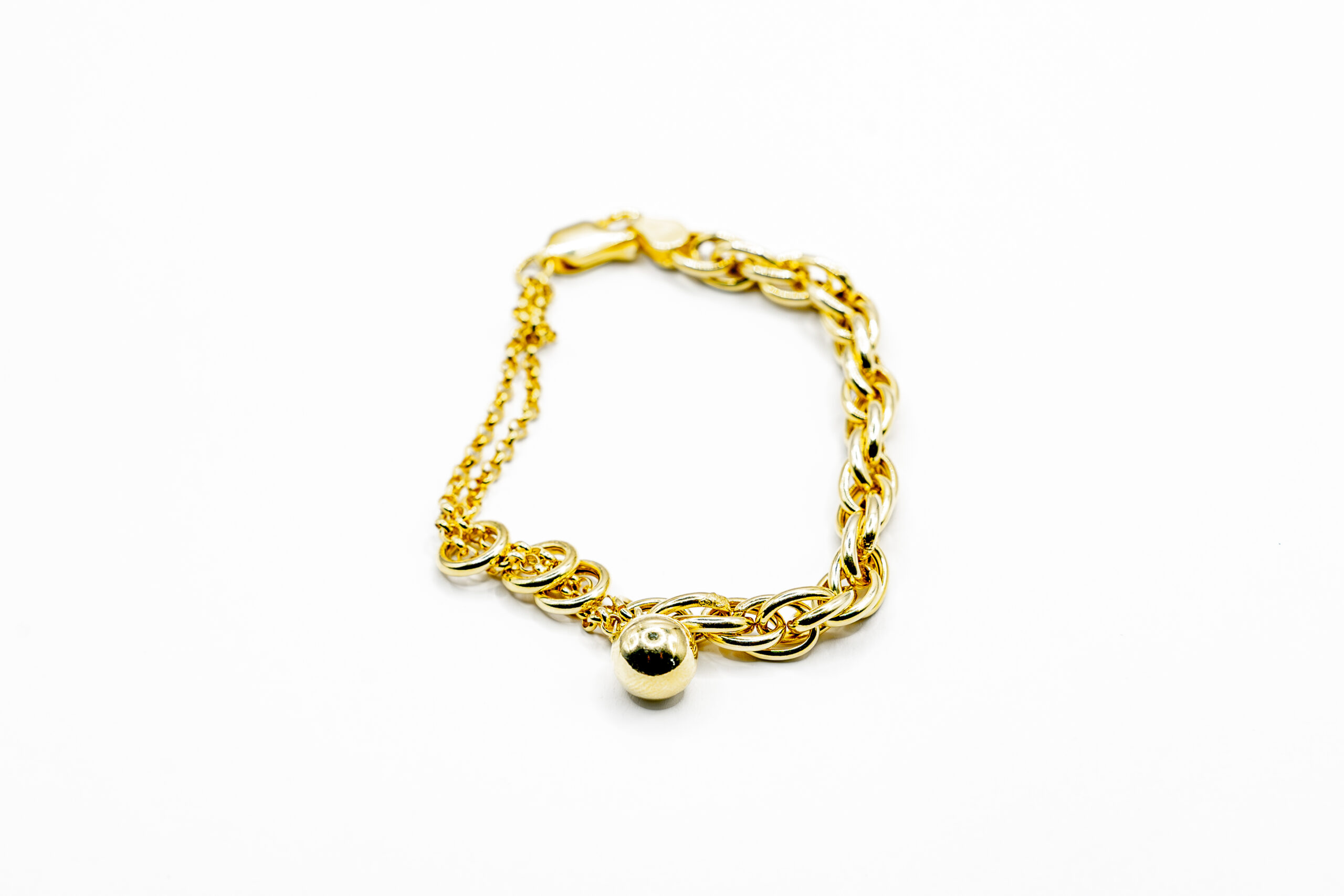 Un accesoriu modern cu personalitate, brățara „DuoSphere” combină două stiluri de lanț – unul fin și unul împletit – într-o compoziție echilibrată și rafinată. Realizată din argint 925 placat cu aur de 14K, această bijuterie se remarcă prin contrastul textural și luciul elegant al finisajului natural.