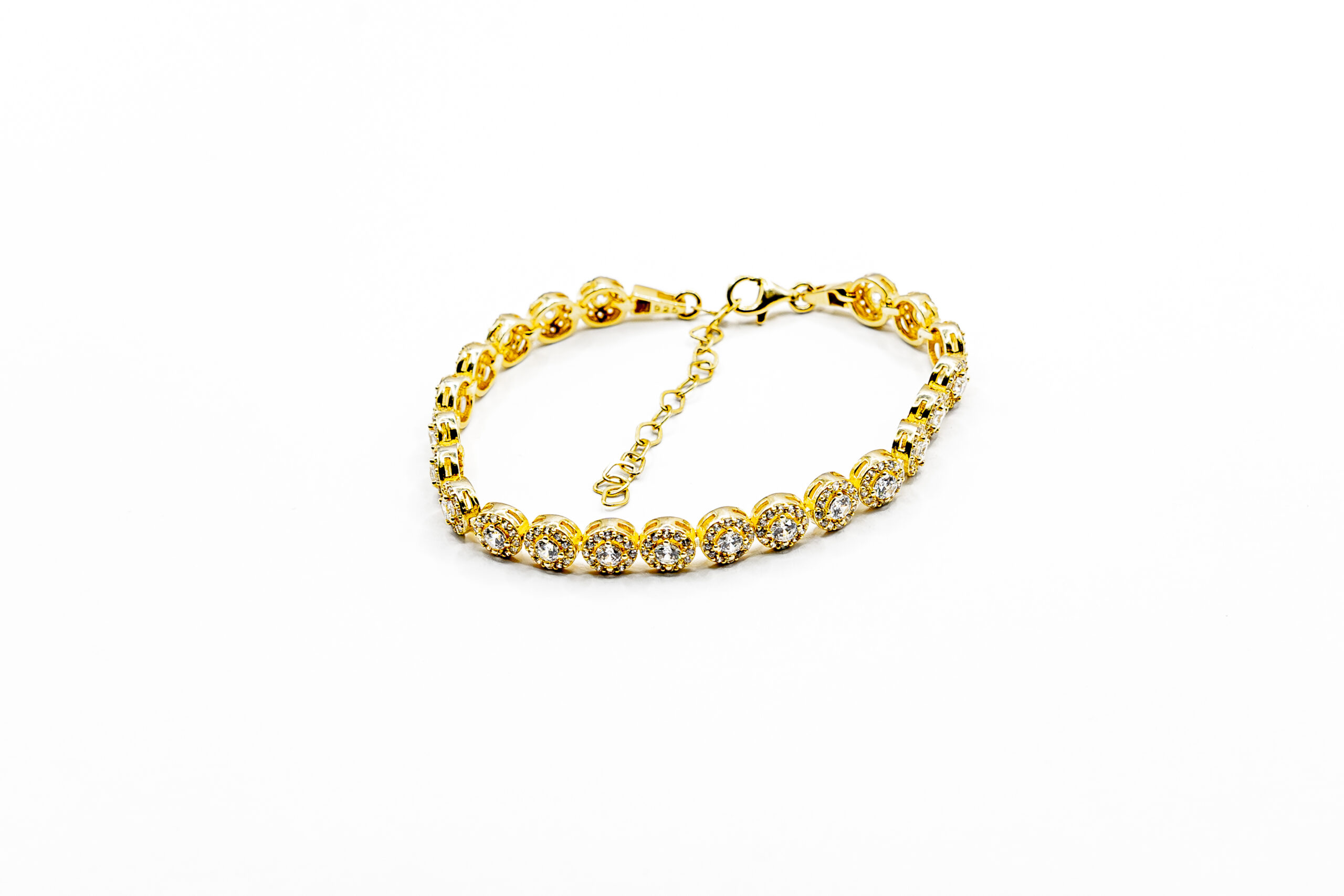- Design: Brățară tip tennis cu montură clasică, compusă din zirconii rotunde, transparente, încastrate individual în prinderi circulare aurii