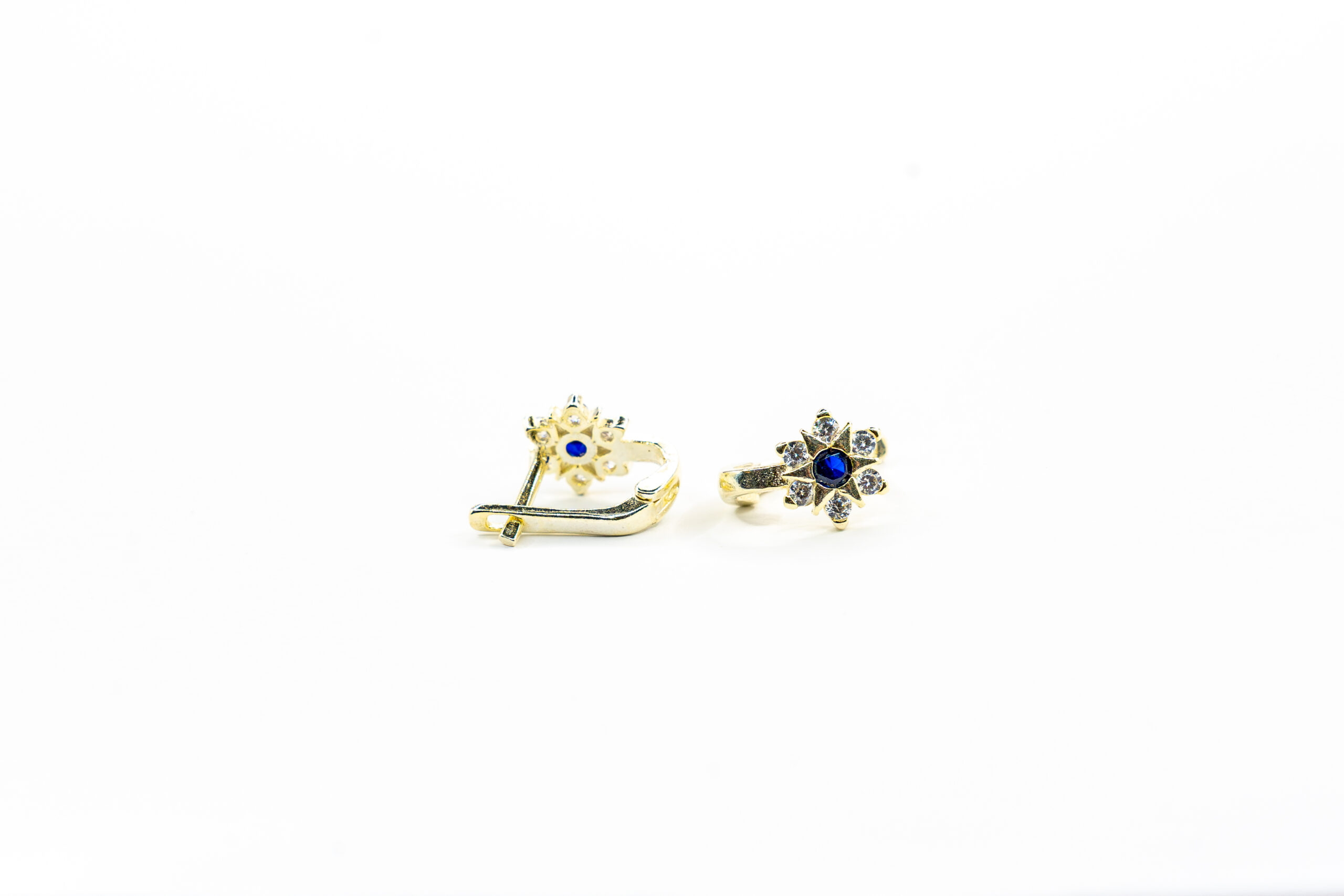 - Design: Cercei cu formă florală stilizată, cu zirconiu cubic albastru în centru și margine decorată cu zirconii transparente. Sistem de prindere cu balama, pentru fixare sigură