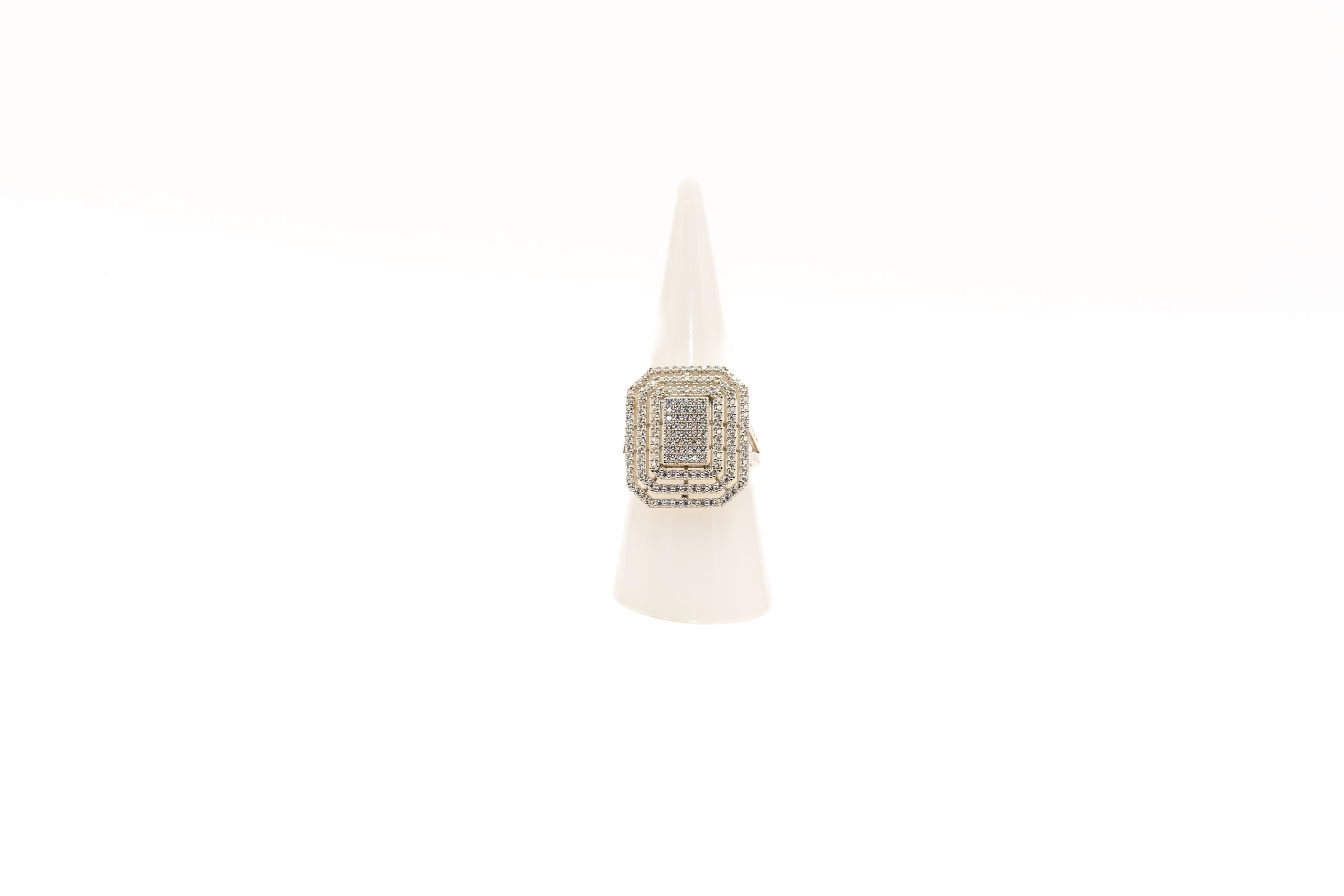 Straturile suprapuse de zirconii transparente sunt dispuse simetric, creând un efect vizual de halo extins și profunzime sculpturală. Montura este lucrată cu precizie, iar finisajul rodiat oferă un luciu intens și protecție împotriva oxidării, păstrând bijuteria impecabilă în timp.