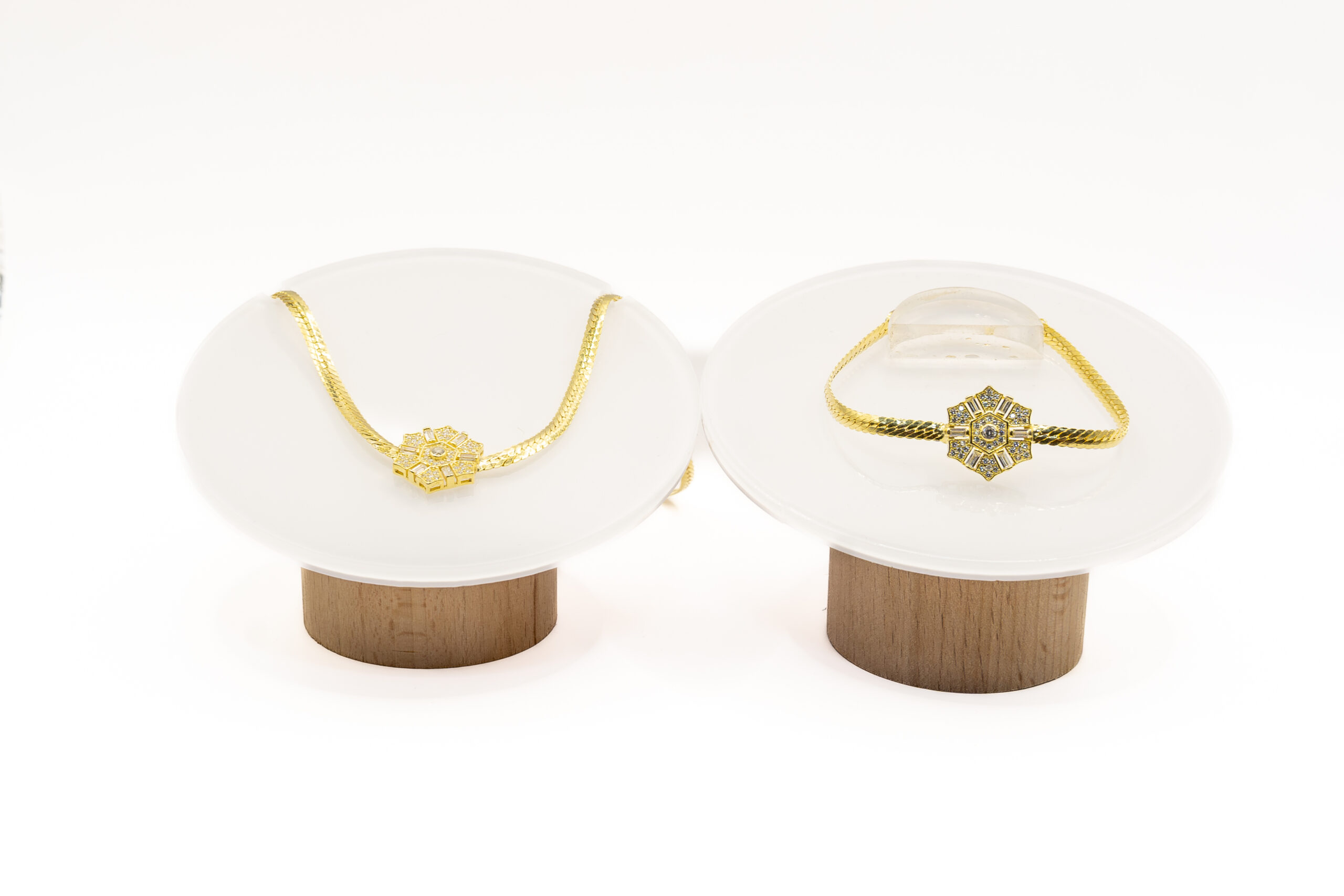 - Design: Set format din colier și brățară cu lanț texturat și element central decorativ, cu motive simetrice și pietre transparente încastrate. Detaliile aurii și formele geometrice conferă un aer sofisticat și versatil